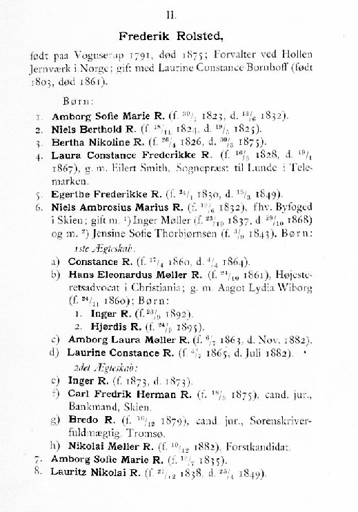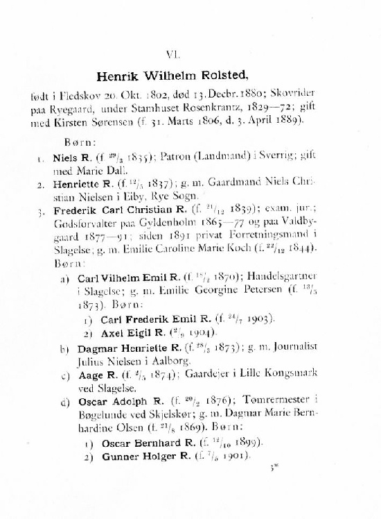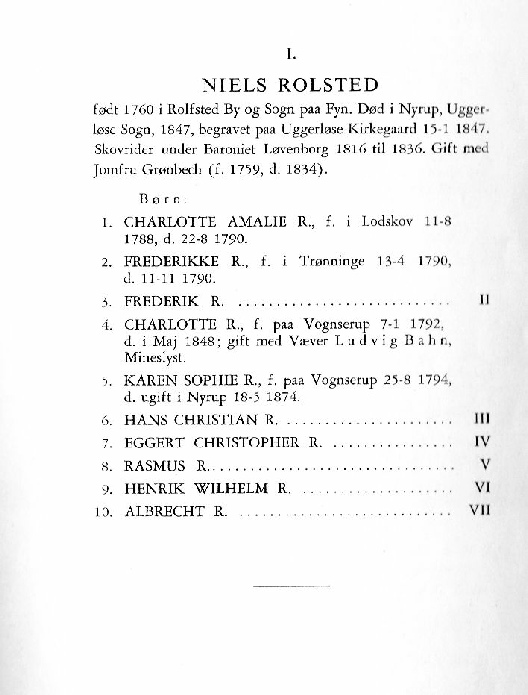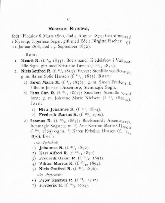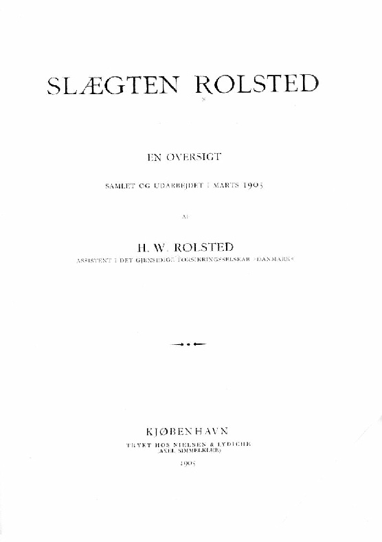 Herunder bringes kopier af den første slægtsbog fra 1905 af H. W. Rolsted. Den første slægtsbog var egentlig kun et hæfte med Niels Rolsteds ”Levnedsløb” og så nedenstående 8 sider med ialt 135 registrerede personer.