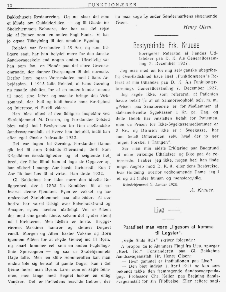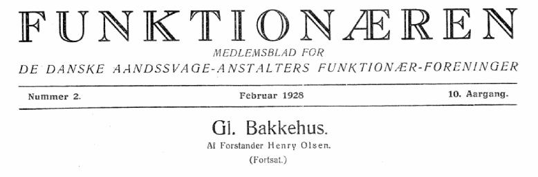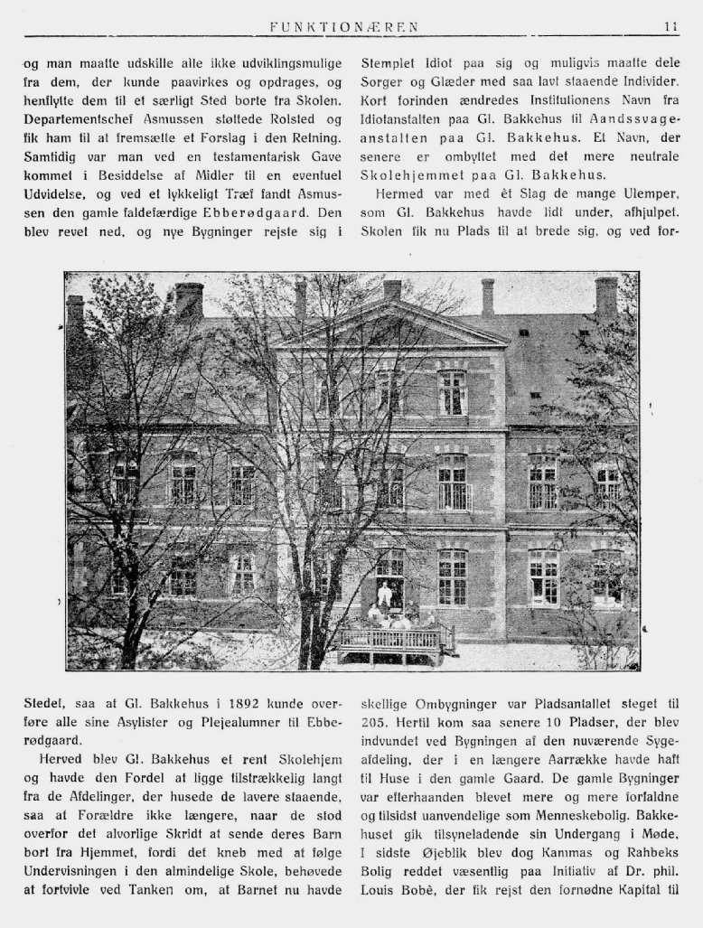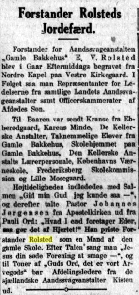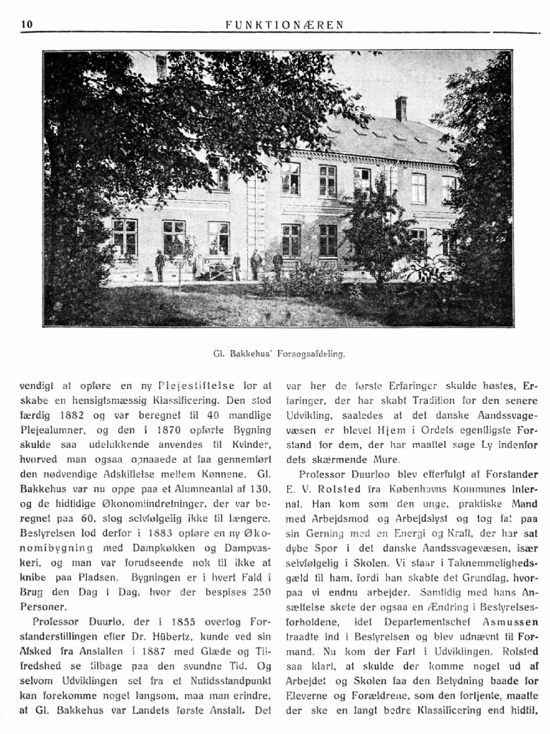 Om den omtalte "Jubilæumsbog", "Aandssvageanstalten paa Gamle Bakkehus 1855-1905. Et Tilbageblik, paa Foranledning af Anstaltens Bestyrelse udarbejdet af E.V. Rolsted, Forstander", skal jeg her tilføje et Par Ord. I første Række skyldes dens Tilblivelse Departementschef Asmussen, der i god Tid opfordrede mig til at skrive den. Gik jeg ind til Arbejdet med nogen Betænkelighed, begyndte det dog snart at interessere mig, og det ikke ubetydelige Arbejde, jeg ofrede paa at gennemgaa Anstaltens Arkiv, gav heldigvis ogsaa et Udbytte til Belysning navnlig af Stiftelsens Forhistorie.