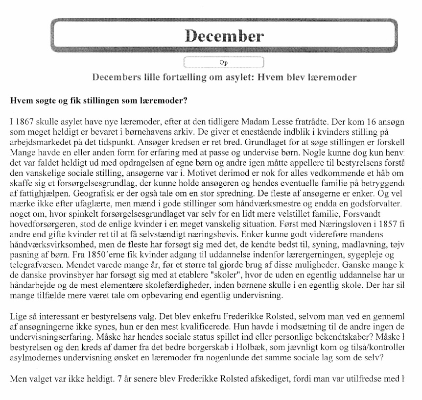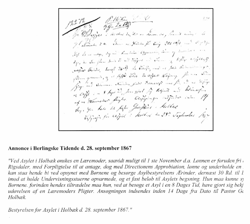Som det fremgår af nedenstående, så søgte og fik Frederikke i 1867 stillingen som læremoder ved asylet i Holbæk, en stilling som hun blev afskediget fra efter syv år, da man ikke fandt hende egnet.