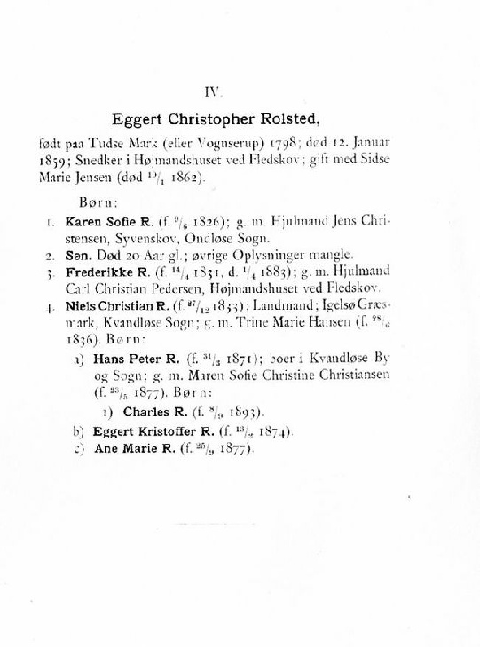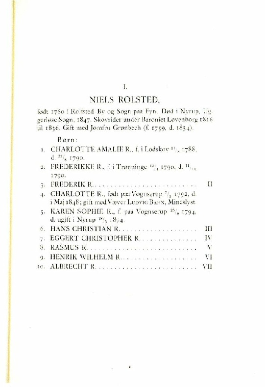 Herunder bringes kopier af den første slægtsbog fra 1905 af H. W. Rolsted. Den første slægtsbog var egentlig kun et hæfte med Niels Rolsteds ”Levnedsløb” og så nedenstående 8 sider med ialt 135 registrerede personer.